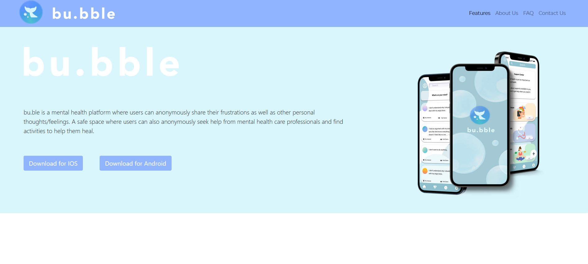 To provide a mental health platform where users can anonymously share their frustrations as well as other personal thoughts or feelings. Bubble provides a safe private space where users can seek help from mental health care professionals and find activities that can help relieve stress.