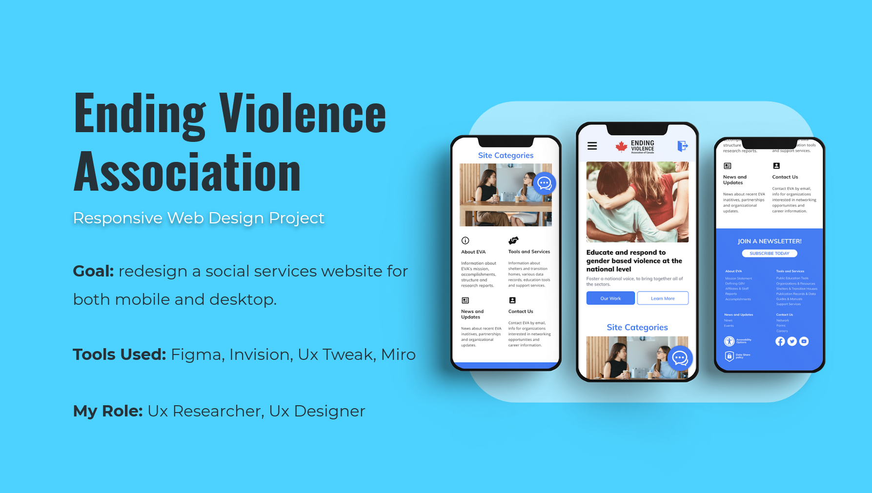 My task was to redesign Ending Violence Association's website for both desktop and mobile formats. Focus was placed on improving usability by overhauling the content structure and providing more intuitive options to find resources.